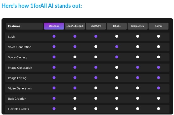 Where 1forAll focuses on multimedia production, 1minAI focuses on model variety. It's the platform for people who genuinely want access to the full landscape of AI models and the ability to compare what each one does best.