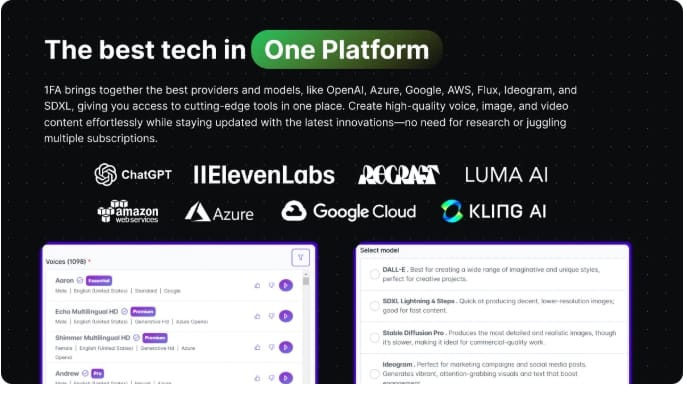 1forAll AI is a unified, AI-driven platform designed to streamline content creation — covering voice, images, and video generation from a single place. It started as a voice tool and has since expanded into a full multimedia studio. The model lineup includes ChatGPT, Claude, Gemini, Llama, DeepSeek, ElevenLabs, Flux, Ideogram, Stable Diffusion, DALL-E, Runway, and Kling — and the list grows each month.
