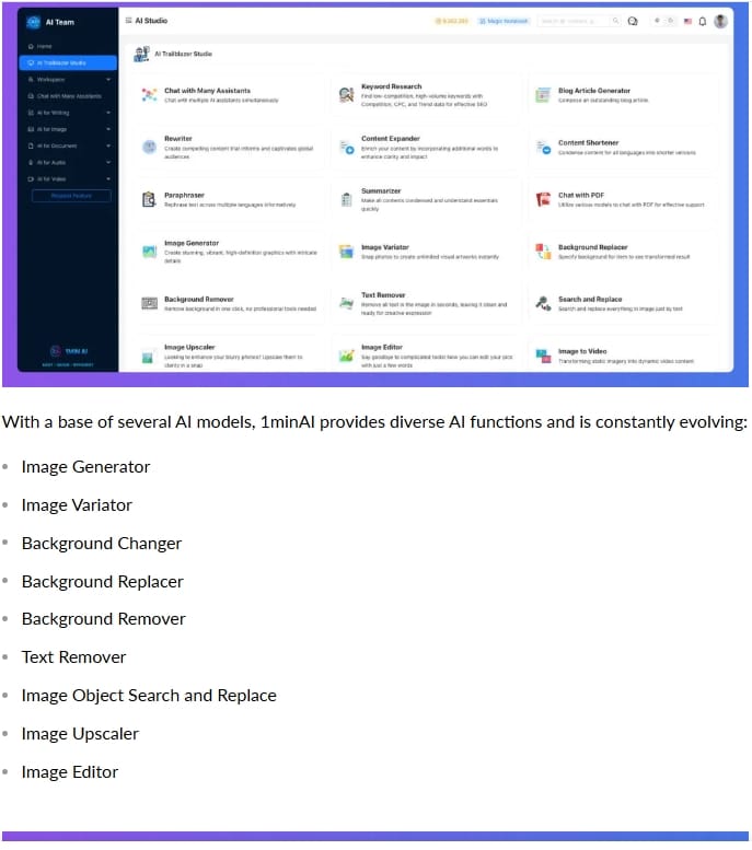 1minAI is an all-in-one AI app that combines ChatGPT, Midjourney-style image generation, Google AI, Anthropic, Stability, and more — designed so you never have to switch between separate tools.